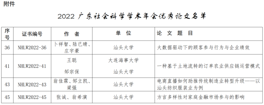 近日,广东省社会科学界联合会发布了《关于公布2022广东社会科学学术年会优秀论文的通知》,金沙官网卜祥智教授、研究生陆已晴、庄宇豪撰写的论文《大数据驱动下的顾客参与行为与企业绩效》;邹宗保副教授及其合作者王聪撰写的论文《一种基于土地流转的订单农业供应链运营模式》;研究生翁佳霖、企业管理系教师邹立凯博士、梁强教授撰写的论文《电商直播如何助推传统制造业转型升级--以汕头纺织服装业为例》;应用经济系教师张诚博士、研究生翁希演撰写的论文《方言多样性对家庭金融市场参与的影响》入选2022广东社会科学学术年会优秀论文。