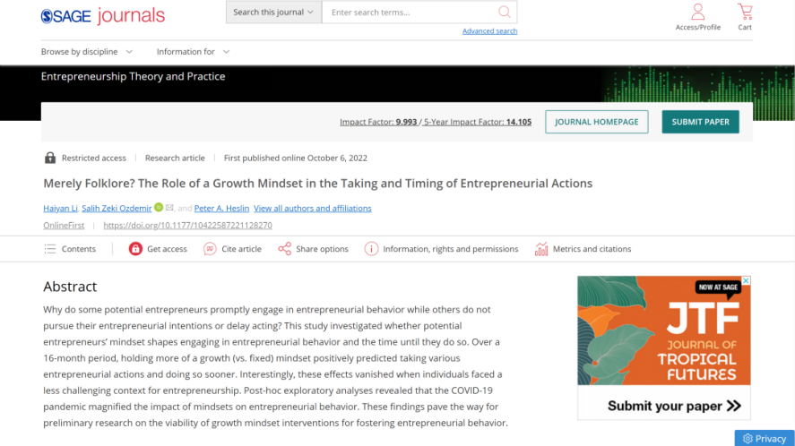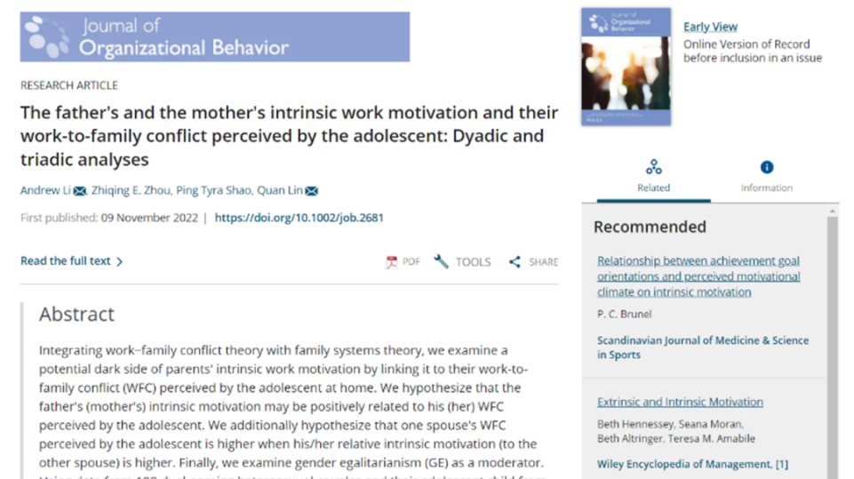 金沙官网周军杰副教授(第一作者)互联网医疗健康交叉研究成果,分别被商科国际顶级期刊MIS Quarterly(UTD24期刊)、顶级商业评论California Management Review接受;林泉教授以通讯作者身份参与合作完成的论文《The father's and the mother's intrinsic work motivation and their work-to-family conflict perceived by the adolescent: Dyadic and triadic analyses》被国际管理学顶级期刊Journal of Organizational Behavior接受并在线发表;青年教师李海燕博士(第一作者)参与合作的论文《Merely Folklore? The Role of a Growth Mindset in the Taking and Timing of Entrepreneurial Actions》在国际顶级期刊Entrepreneurship Theory and Practice 在线发表。
