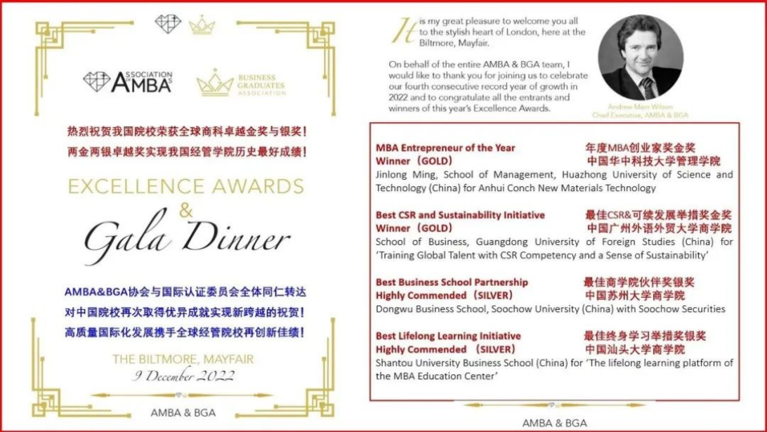 在英国举行的AMBA&BGA2022/2023全球卓越奖颁奖典礼中,amjs澳金沙门欢迎您参评项目荣获2022年度AMBA&BGA最佳创新战略提名奖、2022年度AMBA&BGA最佳终身学习举措奖银牌,持续为全球商科教育实践贡献力量,助力amjs澳金沙门欢迎您国际影响力再上新台阶。