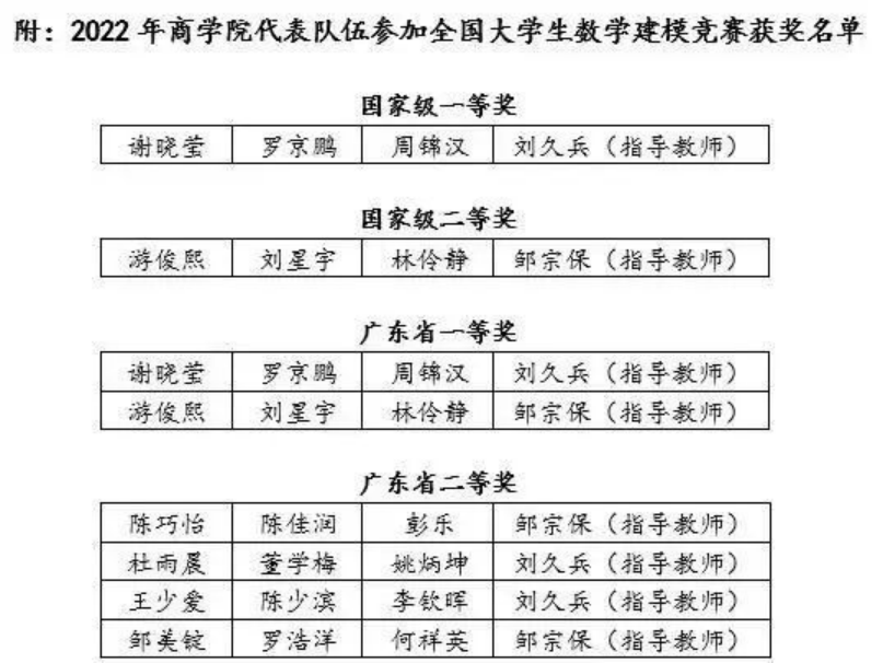 本年度本科生累计荣获全国大学生数学建模竞赛、国际企业管理挑战赛、“泰迪杯”数据挖掘挑战赛、“正大杯”全国大学生市场调查与分析大赛、CMAU市场研究与商业策划大赛等各类国家级奖项28项;以及中国国际“互联网+”大学生创新创业大赛广东省分赛、 “挑战杯”广东大学生创业计划竞赛、“全国大学生英语演讲比赛广东省分赛等各类省级奖项35项;学院研究生获校级以上奖项及荣誉称号共计21项;MBA学生荣获2022年全国企业竞争模拟大赛特等奖、年度华南地区MBA最佳社会责任先锋奖、华南地区MBA优秀干部奖等荣誉称号,各项学生竞赛成果均创历年新高。