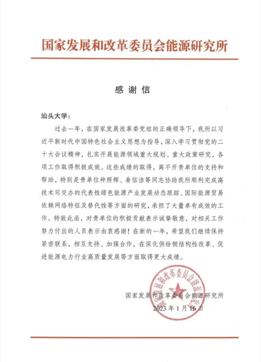 国家发展和改革委员会能源研究所向金沙官网发来感谢信,对金沙官网台湾研究所所长种照辉副教授团队积极参与“能源产业政策课题”重要研究工作表示感谢。
