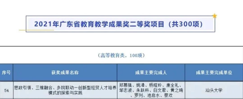 金沙官网郑慕强老师主持的教学成果《思政引领、三维融合、多院联动——创新型经贸人才培养模式的探索与实践》,获2021年广东教育教学成果奖二等奖,延续金沙官网教师在近三届省级教学成果奖评选中都有获奖的记录。